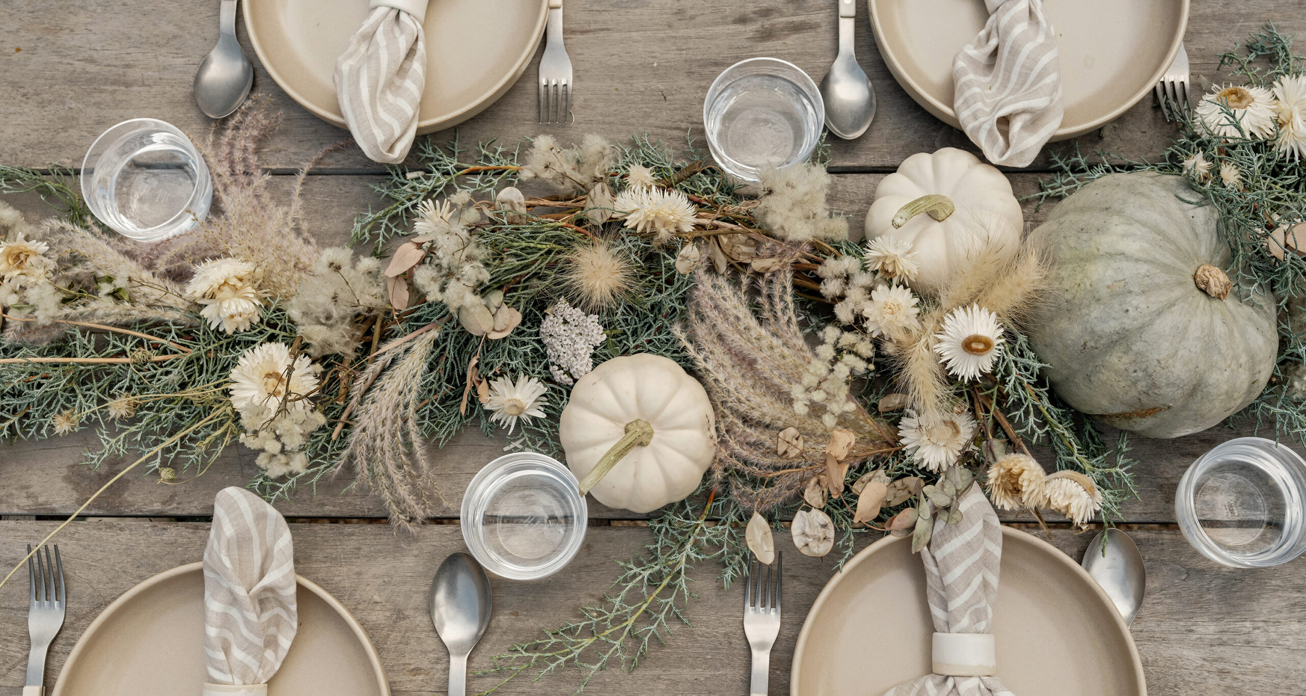 In keeping with a fresher approach, Jenni strayed from the expected Thanksgiving aesthetic with a muted palette of earthy cool-tones. From cream and pale green pumpkins to harvest-inspired foliage, the accents sat in perfect complement to the timeless, neutral shades of her go-to Pacific Dinnerware. Simple, effortless, and emblematic of the season—it’s a scene worth recreating.
