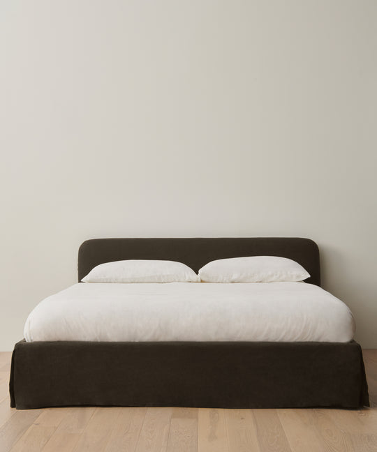 Rounded upholstered headboard featuring luxurious Belgian Libeco linen: 91% linen, 9% nylon. Features a removable Libeco slipcover for everyday ease and a Birch frame.