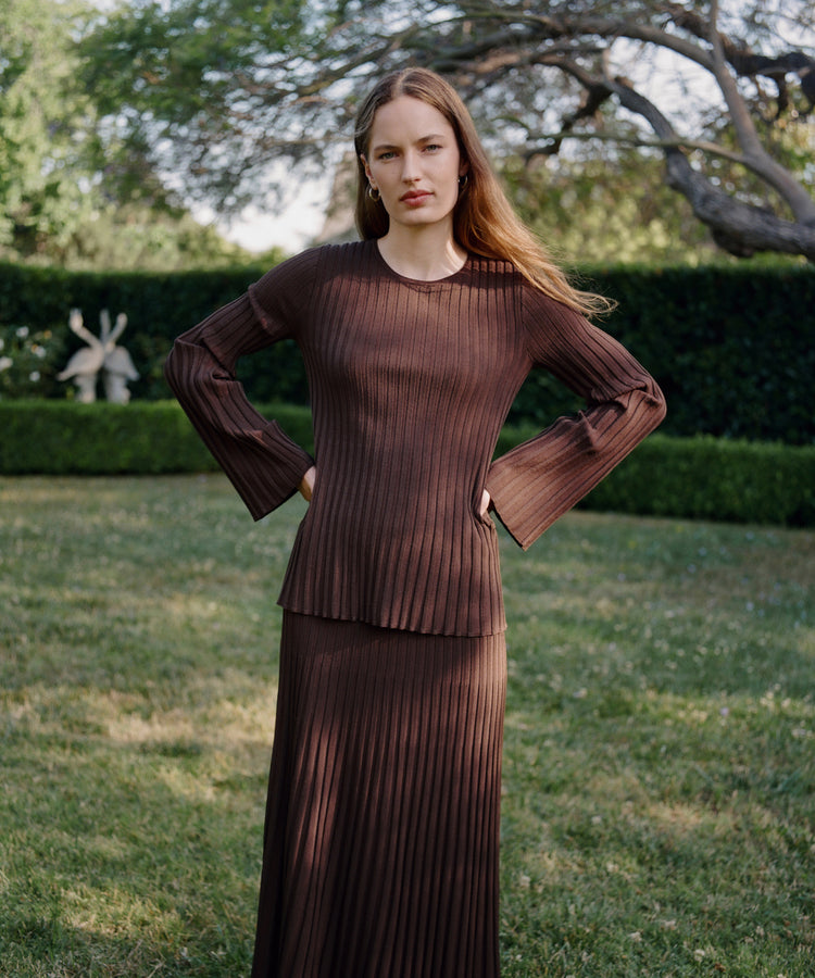 A sculpted rib top with a slight sheen and a pleasantly weighted feel, the Dara Top brings an effortless polish to any ensemble. This top features an A-line shape and bell sleeves for a flattering shape that, when paired with its matching Penelope Skirt, creates a seamless line from top to toe.