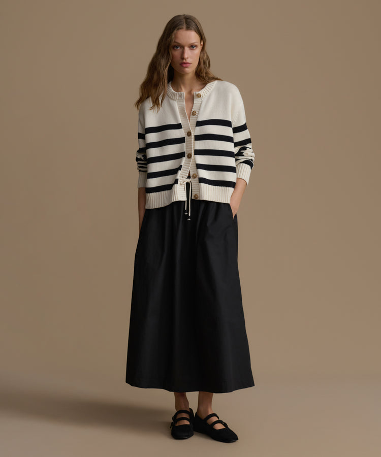 The Hastings Skirt is made from soft washed poplin, featuring a drawstring waist with faux horn tips, topstitched seams, and practical pockets for casual dressing perfection. Laid back, comfortable, and subtly utility-inspired, it’ll be your go-to for everyday wear—for errands, office days, and beach strolls alike.