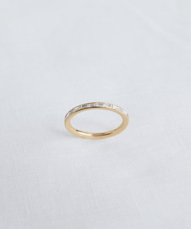 With diamonds covering half of the band, the June Baguette Band is easily sizable and always versatile.