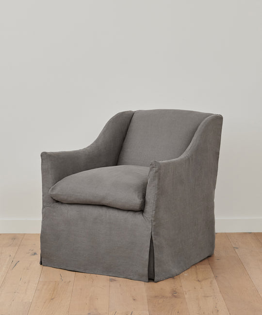 Elegant chair crafted from luxurious Belgian Libeco linen: 100% linen slipcover. Features feather down fill and foam core.