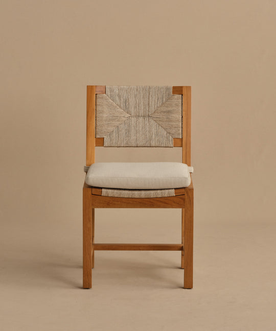• Outdoor dining chair made from solid teak with a natural finish. Features corrosion-resistant stainless steel hardware and a seat and back crafted from ECOLENE—engineered for superior durability, resistance to temperature fluctuations, and free from cracking, splintering, or corrosion, all while maintaining a natural look and feel.