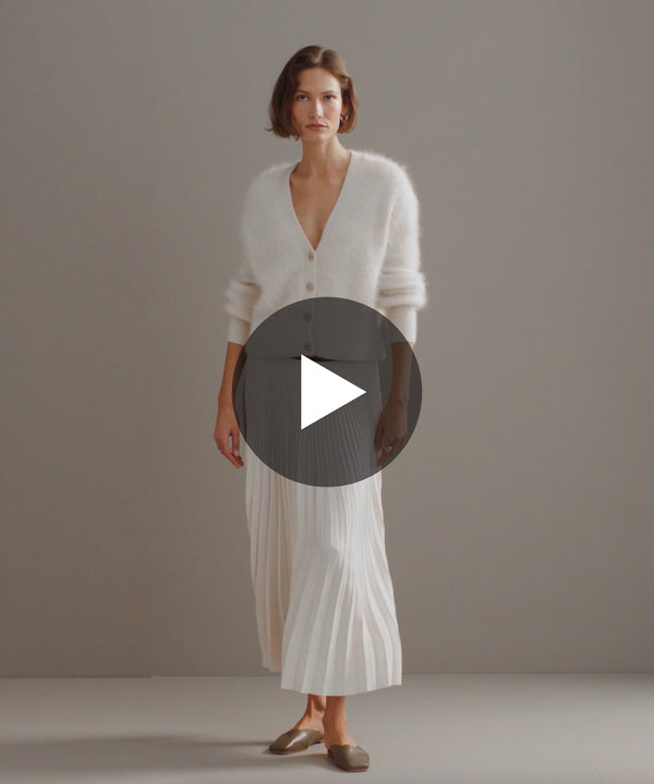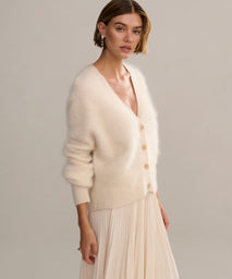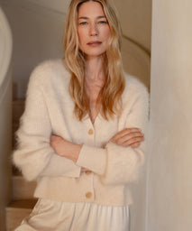 Knit in brushed 100% cashmere with a fluffy, cloud-like texture, this sweater brings a touch of luxury to every look. We love the four-button front, the V-neck, the extended cuffs that slightly puff at the forearms, and the cropped, relaxed fit. Dress it up with the Demi Pant or down with classic denim.