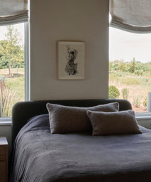 Rounded upholstered headboard featuring luxurious Belgian Libeco linen: 91% linen, 9% nylon. Features a removable Libeco slipcover for everyday ease and a Birch frame.
