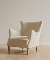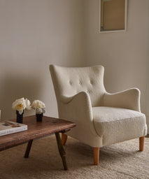 Tufted tight-seat chair featuring White Oak legs and Italian Mini Boucle: 51% cotton, 17% viscose, 15% acrylic, 9% linen, 8% polyester.