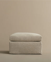 Classic ottoman featuring Libeco linen upholstery crafted in Belgium: 91% linen and 9% nylon slipcover with a feather down fill.