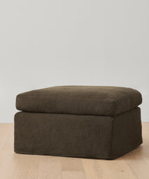 Classic ottoman featuring Libeco linen upholstery crafted in Belgium: 91% linen and 9% nylon slipcover with feather down fill.