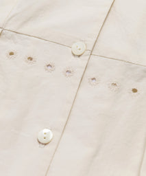 - Breezy dress with slight puffed, elbow-length sleeves, button front, and embroidered eyelets. Hits mid-calf.