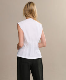 • Sleeveless button front top with pleats at waist for waist shape. Hits below hip bones.