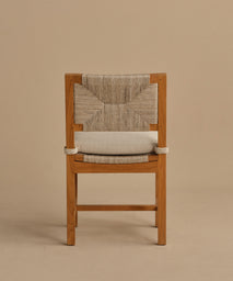 - Outdoor dining chair made from solid teak with a natural finish. Features corrosion-resistant stainless steel hardware and a seat and back crafted from ECOLENE—engineered for superior durability, resistance to temperature fluctuations, and free from cracking, splintering, or corrosion, all while maintaining a natural look and feel.