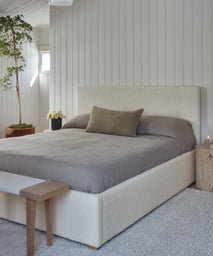Iconic upholstered headboard featuring luxurious Belgian Libeco linen: 71% linen, 14% wool, 9% viscose, 6% polyester.