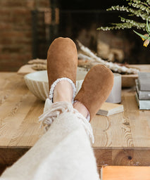 Moroccan-style slippers with shearling-lined suede upper and suede outsole.