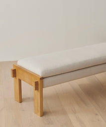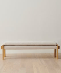 Luxurious bench crafted from Belgian Libeco linen with a White Oak frame and a natural finish.